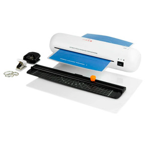 Это готовое рабочее место для полного цикла обработки: надежное ламинирование плотностью до 125 мкм, точная обрезка, профессиональное скругление углов и перфорация отверстий.